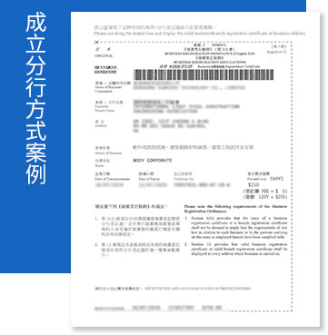 >注册新的有限公司或已有香港有限公司,在有限公司名下注册分行。 分行名以香港协会、国际协会、香港商会、国际商会、香港联合会、香港基金会、国际基金会、促进会、中心、研究院等字号结尾即可。一个有限公司的名下可以有多个分行。 此分行注册形式,等同于分公司,每年都需要和总公司一起年审,支付每年的商业登记证更新费用。成立一个分行都会有一张商业登记证。